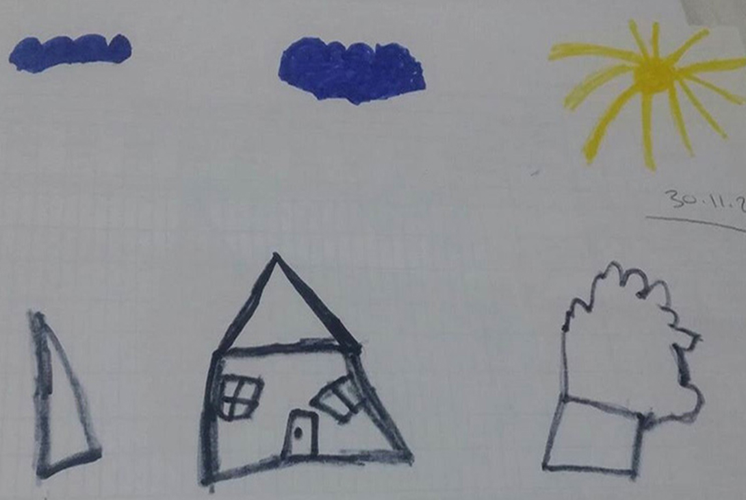 Yukarıda bir çocuk dilinden resim örneği görmekteyiz. Bu resimde ailesi tarafından sürekli yaramazlık yaptığı ileri sürülen bir çocuğun yaşadığı eve olan algısı söz konusudur. Çocuğun dengesini bozan unsurlar resme yansıdığında resimde de kompozisyonu bozan imgelerle karşılaşırız. Resimde evin çatısı dışında başka bir çatının kompozisyonla ilgisiz olarak resimde var olması çocuğun dünyasının bize vermek istediği bir mesajdı sadece. ‘Neden orada bir çatı vardı?’ Çocuğun dili bize şunu dedi: ‘Çünkü evin çatısını çocuk bozmuş…’ Ailesinin bu ‘yaramaz’ kavramı sürekli çocuğun yanında ifade etmesini, evin düzeninin bozulmasından tümüyle çocuğun sorumlu tutulmasını çocuk, çoktan benimsemiş ve bunu bize ifade etmişti. Artık dünyasında sürekli yaramazlık yapan çocuk imgesi dolaşıyordu…