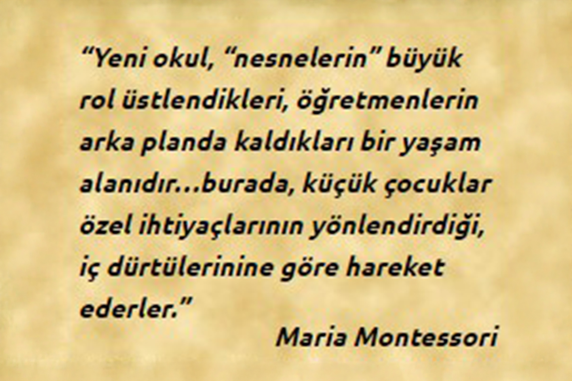 “Yeni okul, “nesnelerin” büyük rol üstlendikleri, öğretmenlerin arka planda kaldıkları bir yaşam alanıdır…burada, küçük çocuklar özel ihtiyaçlarının yönlendirdiği, iç dürtülerinine göre hareket ederler.”Maria Montessori